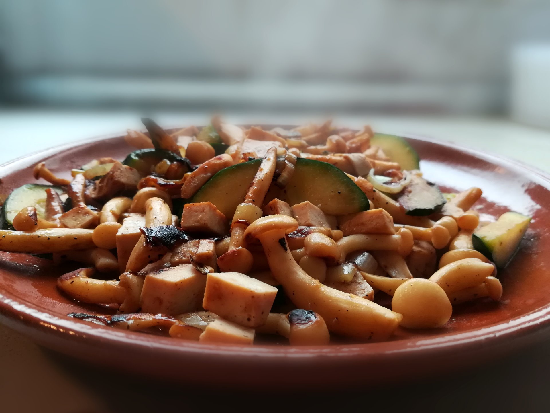 Añadimos en tofu contado a dados, la salsa de soja y sal al gusto.